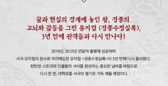 뮤지컬 경종수정실록을 기다리신 분들은 이번 예매 기회를 놓치지 마세요.