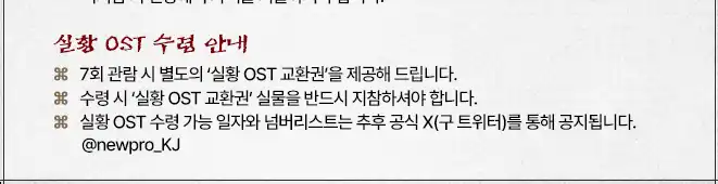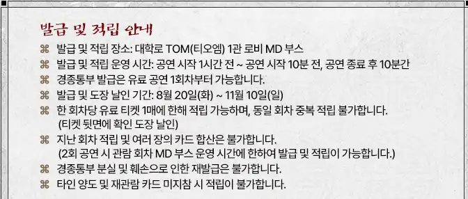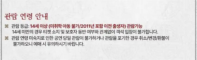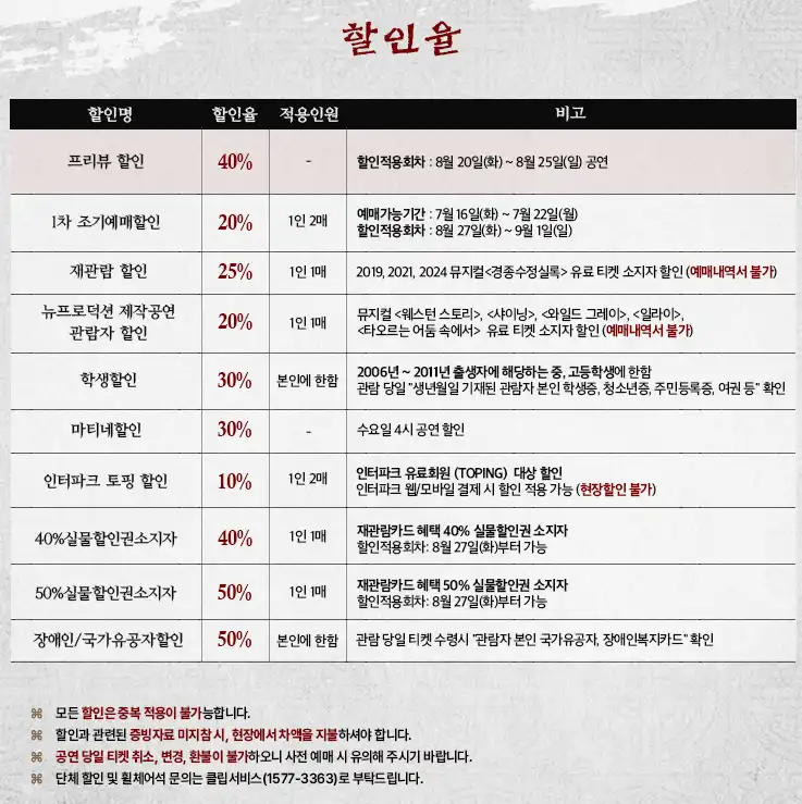 | 재관람할인(지난유료티켓지참,1인1매)25% | 52,500원 | 37,500원 | 할인여부 확인🔍 |
