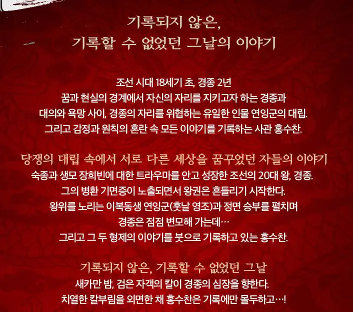 숙종과 장희빈의 아들, 경종은 병환으로 왕권이 흔들리며 이복동생 연잉군과 대립하게 된다. 이 두 형제의 이야기는 홍수찬에 의해 기록되며, 한밤중에 경종이 자객의 공격을 받는 순간에도 홍수찬은 기록에 몰두하는데.