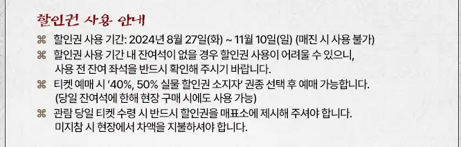 | 1차 조기예매할인(1인2매)20% 2024.07.12 ~ 2024.07.22 예매 시까지 |