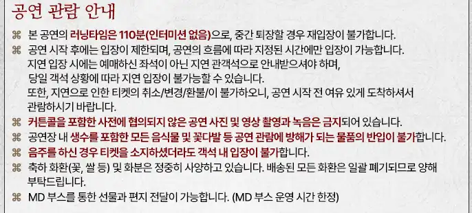 공연 일정은 배우 및 제작사 등의 상황에 따라 언제든 바뀔 수 있으니 꼭 확인 후 예매 하세요