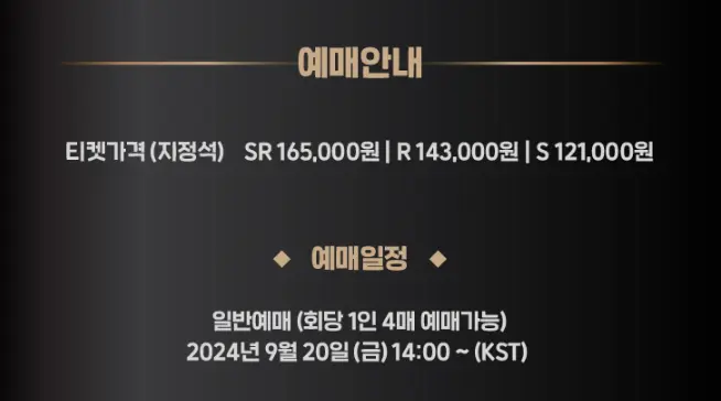 SR석 165,000원 / R석 143,000원 / S석 121,000원 (전석 지정석)