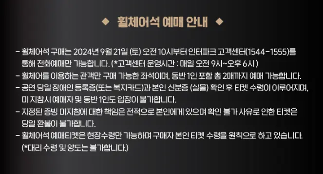 # 휠체어석 구매는 9월 21일(토) 오전 10시부터 인터파크 고객센터(1544-1555)를 통해 전화 예매만 가능합니다.