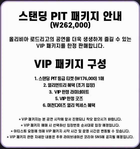 | 스탠딩 PIT 패키지 | 262,000원 | 좌석 상세보기🔍 |