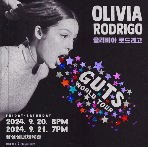 올리비아 로드리고 첫 내한공연 "Olivia Rodrigo - GUTS World Tour"가 2024년 9월 20일(금) ~ 9월 21일(토), 잠실실내체육관에서 진행됩니다.