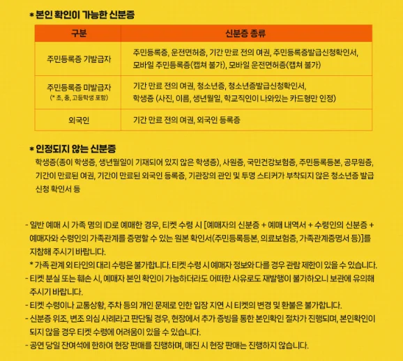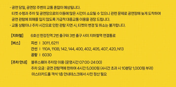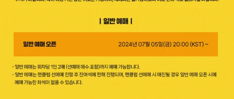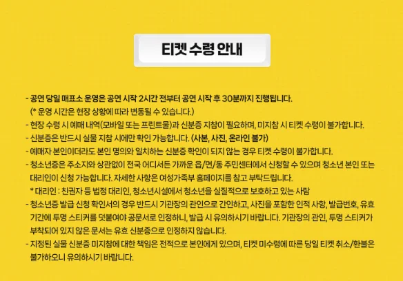 티켓 오픈 시간이 되면 예매 사이트가 자주 다운되며, 대기 순서가 매우 늦을 가능성이 매우 높습니다.