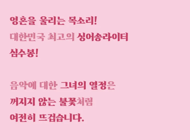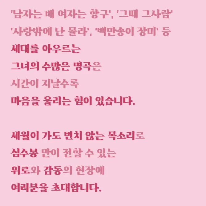 심수봉을 좋아하시는 분들은 이번 예매 기회를 놓치지 마세요.