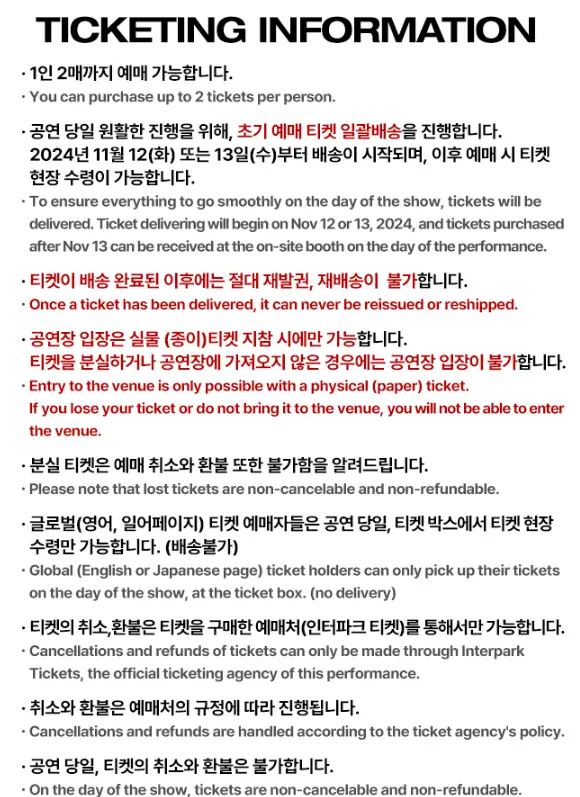 - 사전에 인터파크 티켓에 로그인하고 결제 정보를 미리 입력해 두면 예매 성공 확률이 높아집니다.
