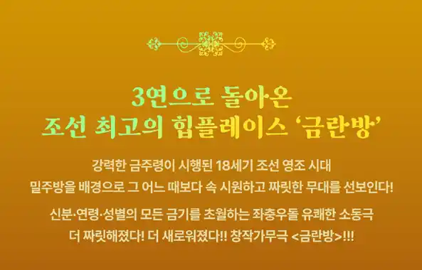 서울예술단의 레퍼토리 창작가무극 〈금란방〉이 국립극장 하늘극장에서 세 번째 시즌으로 관객들을 맞이합니다.