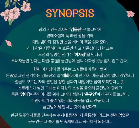 왕의 서간관리자인 김윤신은 연애소설에 푹 빠진 왕을 위해 매일 밤마다 침침한 눈을 비비며 책을 읽어줍니다.