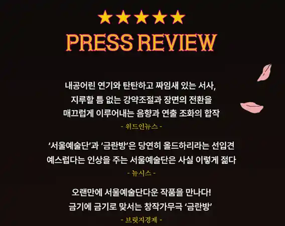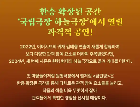 국립극장과 공동 기획한 〈금란방〉은 원형극장인 하늘극장에서 공연되며, 관객들을 밀주방에 찾아온 손님으로 설정하여 보다 능동적으로 공연에 참여할 수 있는 이머시브 공연으로 주목받고 있습니다.