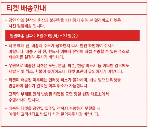 티켓 오픈 시간이 되면 예매 사이트가 자주 다운되며, 대기 순서가 매우 늦을 가능성이 매우 높습니다.